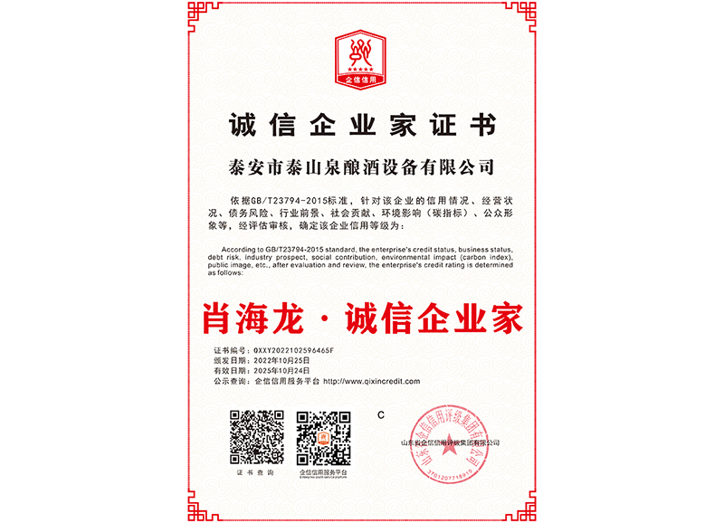 泰安市泰山泉釀酒設備有限公司,是一家專業從事釀酒設備機械化研發并集技術咨詢,工程設計,制造安裝,人員培訓及售后服務為一體的綜合性企業,本公司主要產品為:大曲清香、小曲清香、大曲醬香、大曲濃香等香型白酒機械化設備。 本公司與中國科學院自動化研究所簽訂技術服務合同,引進先進技術,研究生產全自動化機械釀酒設備,由中國科學自動化研究所的技術支持,打造最先進的生產釀酒設備,公司有信心打造全國最先進白酒...